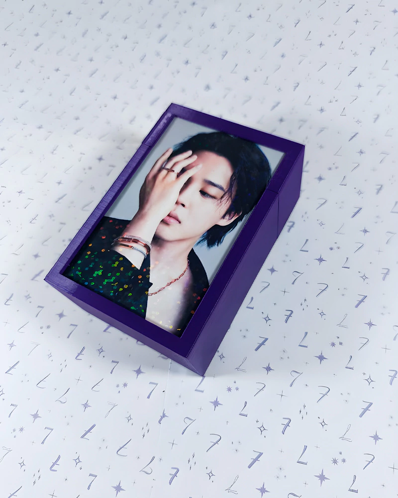 O grande diferencial está na parte frontal: você pode inserir um photocard na frente da deck box, identificando exatamente qual membro (ou coleção) está ali dentro, sem precisar abrir. E de quebra, essa mesma área transforma a caixinha em um mini porta-retrato, deixando seu card em destaque do jeitinho que ele merece. 🖼️💜